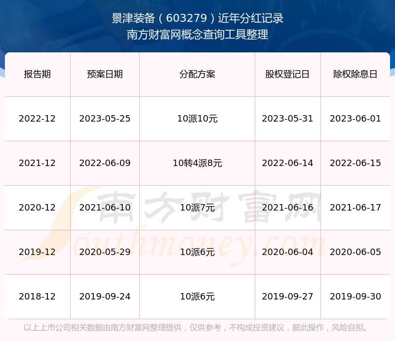 景津裝備最新一次公布的分紅方案為10派10元。本次權(quán)益分派股權(quán)登記日為2023年5月31日,除權(quán)除息日為2023年6月1日,派息日為2023年6月1日。