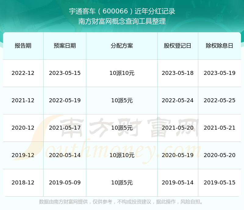 宇通客車最新一次公布的分紅方案:10派10元。