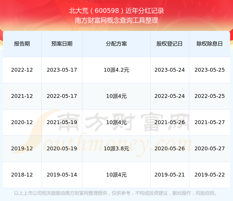 北大荒最新一次公布的分紅方案為10派4.2元。本次權(quán)益分派股權(quán)登記日為2023年5月24日,除權(quán)除息日為2023年5月25日,派息日為2023年5月25日。