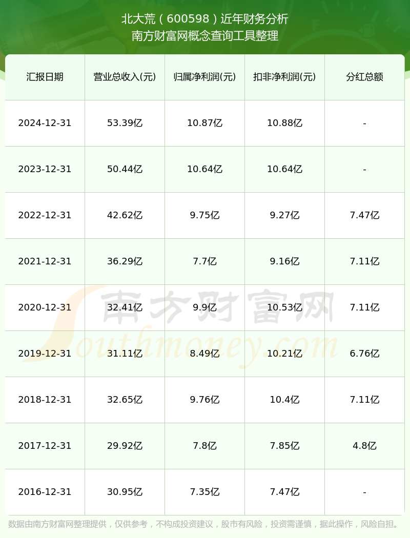 北大荒2024年總營收53.39億,同比增長5.83%;凈利潤10.87億,同比增長2.21%;銷售毛利率34.59%。