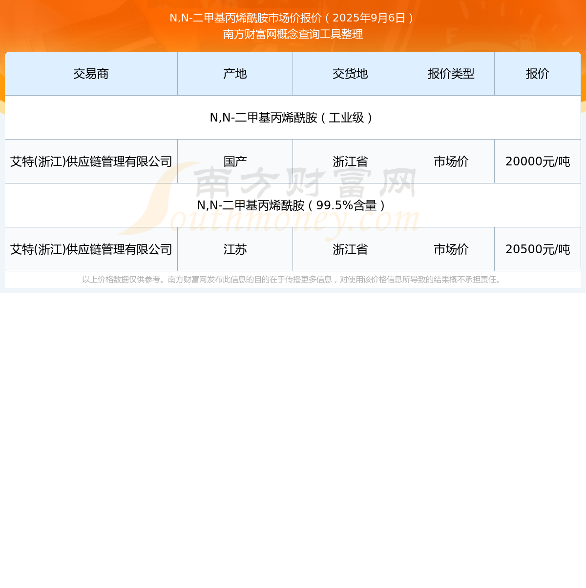 2025年9月6日,艾特(浙江)供應(yīng)鏈管理有限公司N,N-二甲基丙烯酰胺(工業(yè)級(jí)),國(guó)產(chǎn),交易地點(diǎn)為浙江省,市場(chǎng)價(jià)報(bào)價(jià)為20000.00元/噸。