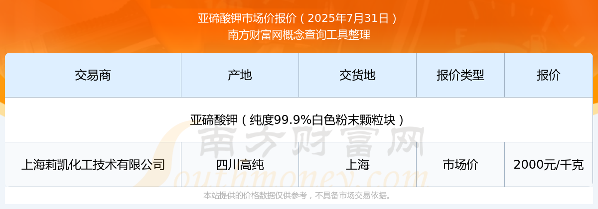 2025年7月31日,上海莉凱化工技術(shù)有限公司亞碲酸鉀(純度99.9%白色粉末顆粒塊),四川高純,交易地點(diǎn)為上海,市場(chǎng)價(jià)報(bào)價(jià)為2000.00元/千克。