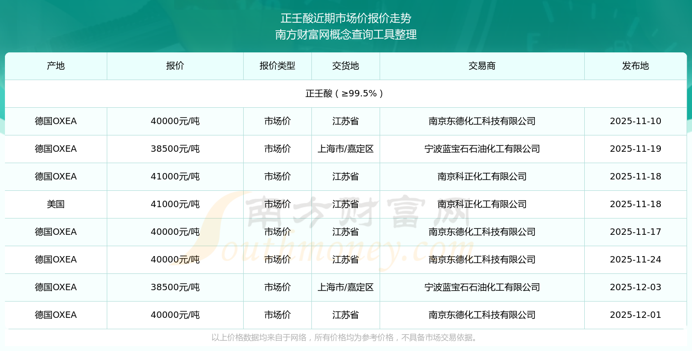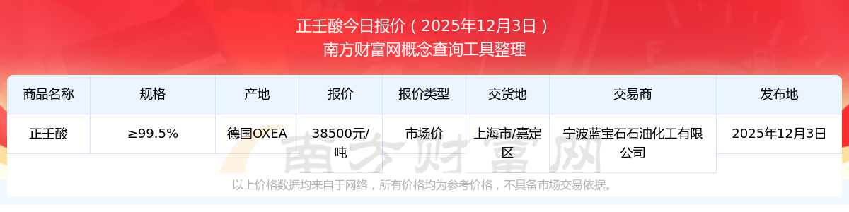 2025年12月3日,正壬酸(≥99.5%)市場價價格為38500.00元/噸,報價人:寧波藍寶石石油化工有限公司,交易地點為上海市/嘉定區(qū)。