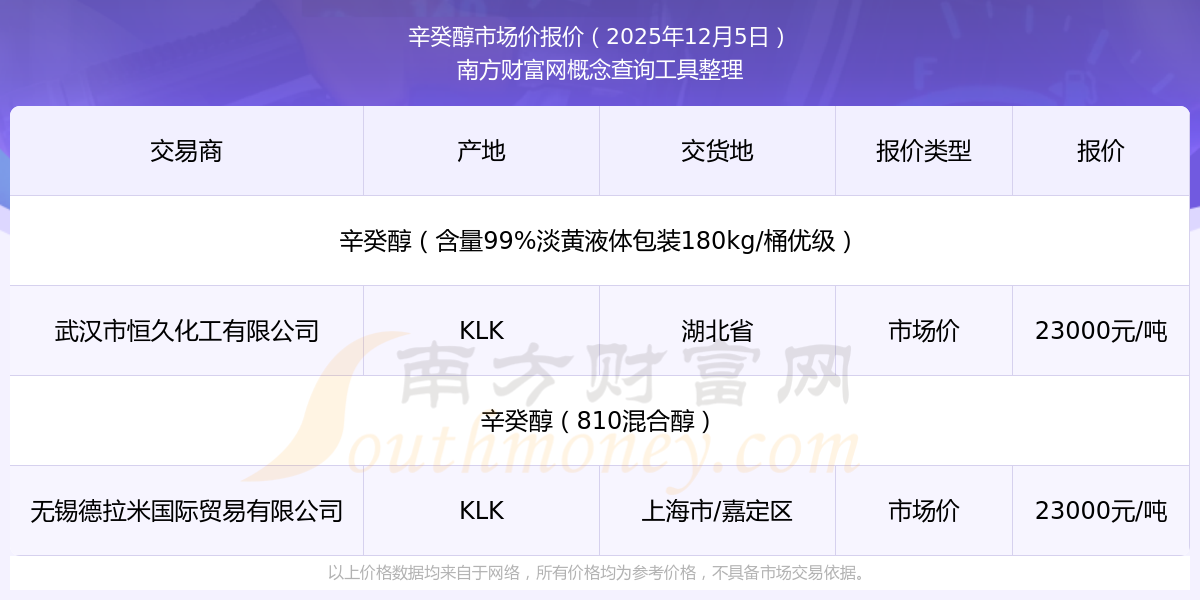 2025年12月5日,武漢市恒久化工有限公司辛癸醇(含量99%淡黃液體包裝180kg/桶優(yōu)級(jí)),KLK,交易地點(diǎn)為湖北省,市場(chǎng)價(jià)報(bào)價(jià)為23000.00元/噸。
