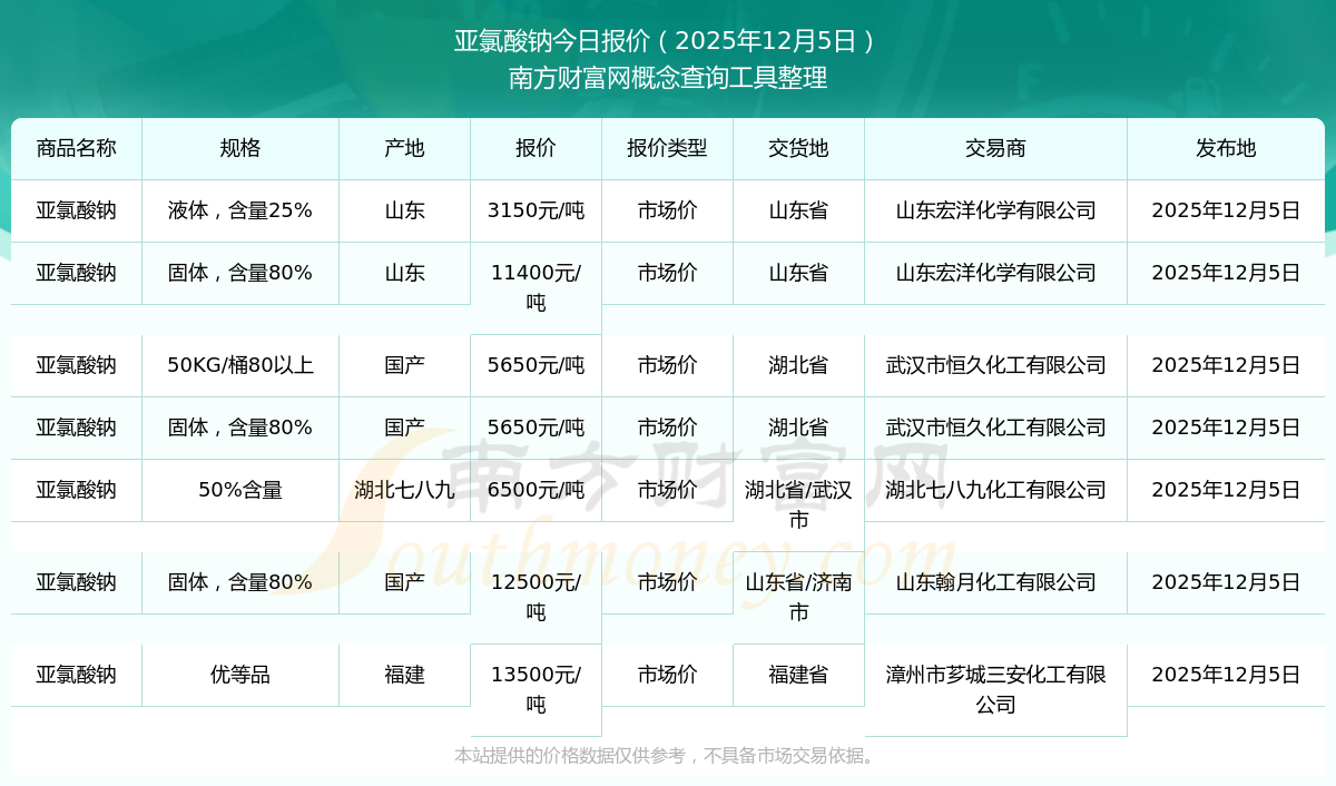 2025年12月5日,亞氯酸鈉(固體,含量80%)市場價(jià)價(jià)格為11400.00元/噸,報(bào)價(jià)人:山東宏洋化學(xué)有限公司,交易地點(diǎn)為山東省。