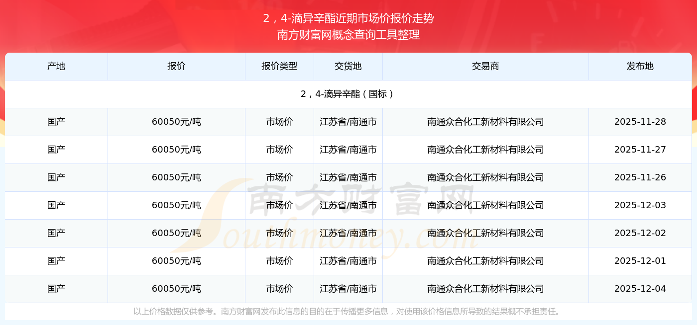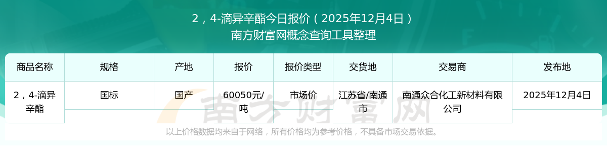 2025年12月4日,2,4-滴異辛酯(國標(biāo))市場價(jià)價(jià)格為60050.00元/噸,報(bào)價(jià)人:南通眾合化工新材料有限公司,交易地點(diǎn)為江蘇省/南通市。