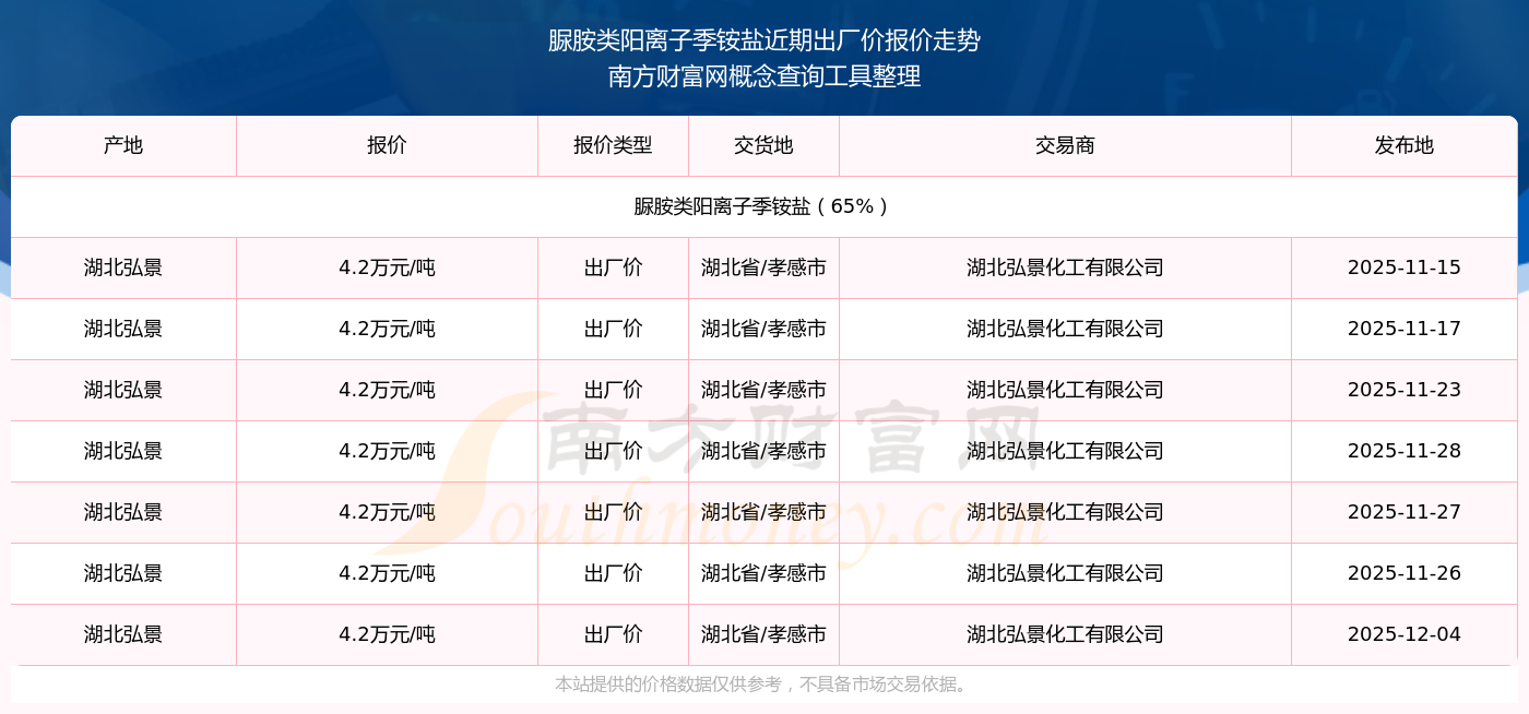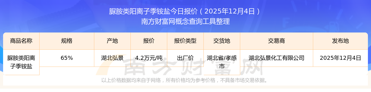 2025年12月4日,湖北弘景化工有限公司脲胺類陽(yáng)離子季銨鹽(65%),湖北弘景,交易地點(diǎn)為湖北省/孝感市,出廠價(jià)報(bào)價(jià)為4.20萬元/噸。
