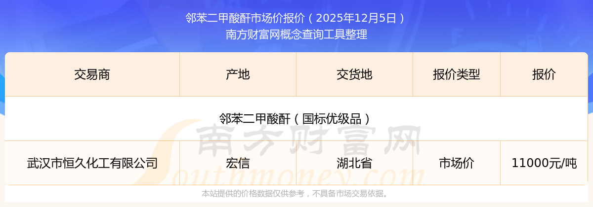 2025年12月5日,鄰苯二甲酸酐(國標(biāo)優(yōu)級品)市場價價格為11000.00元/噸,報價人:武漢市恒久化工有限公司,交易地點為湖北省。