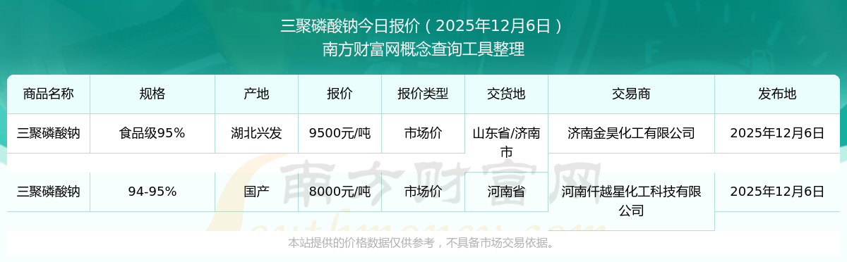 2025年12月6日,濟(jì)南金昊化工有限公司三聚磷酸鈉(食品級(jí)95%),湖北興發(fā),交易地點(diǎn)為山東省/濟(jì)南市,報(bào)價(jià)為9500.00元/噸。
