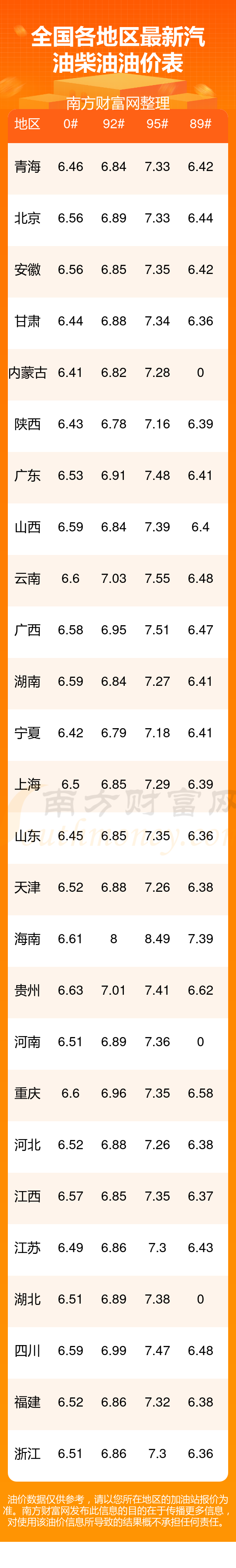全國各地區(qū)最新油價表
