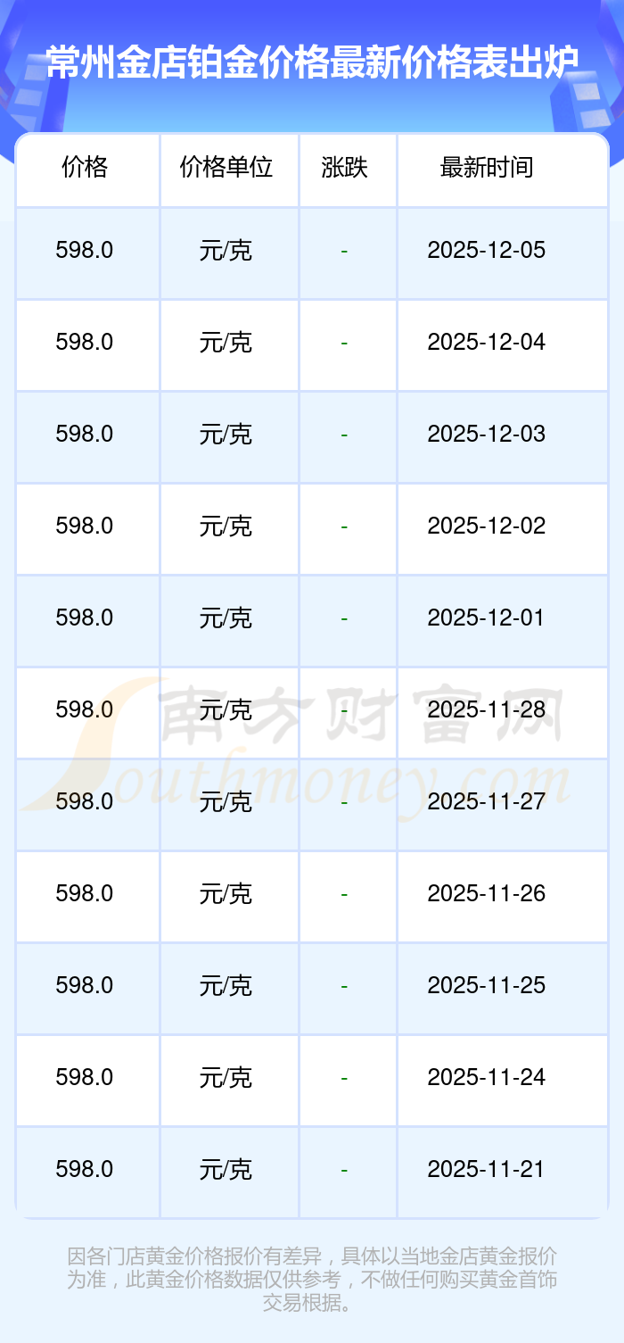 今日常州金店 鉑金價(jià)格最新的克重售價(jià)為598.0元/克。