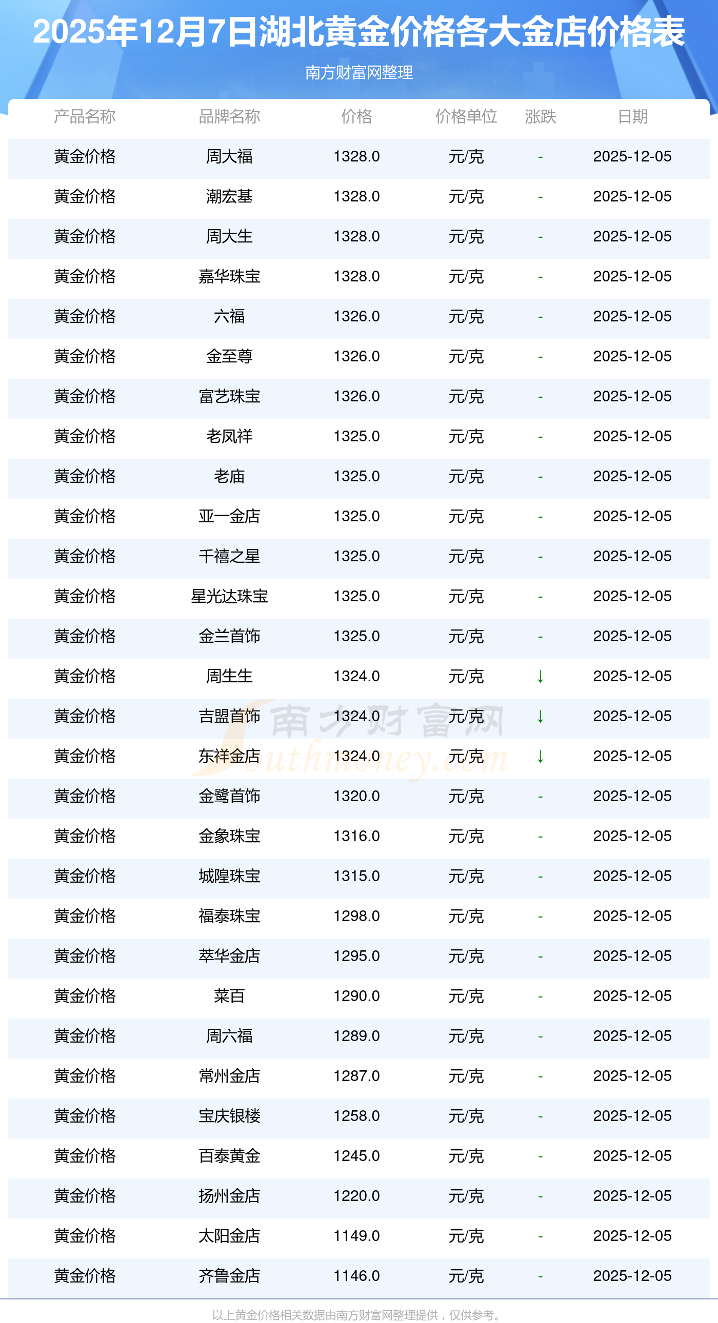 2025年12月7日湖北周大福、周大福、周大福、周大福、周大福、周大福、周大福、老鳳祥、老鳳祥、老鳳祥、周六福等各大金店品牌黃金價(jià)格最新價(jià)格行情來(lái)了,如下:周大福黃金價(jià)格1328.0元/克,周大福鉑金價(jià)格662.0元/克,周大福飾品金價(jià)(內(nèi)地)1328.0元/克,周大福黃金飾品(香港)46550.0,周大福鉑金價(jià)格(香港)18970.0,周大福金條價(jià)格(香港)41990.0,周大福金條金價(jià)(內(nèi)地)1165.0元/克,老鳳祥黃金價(jià)格1325.0元/克,老鳳祥鉑金價(jià)格600.0元/克,老鳳祥足金價(jià)格1325.0元/克,周六福黃金價(jià)格1289.0元/克。