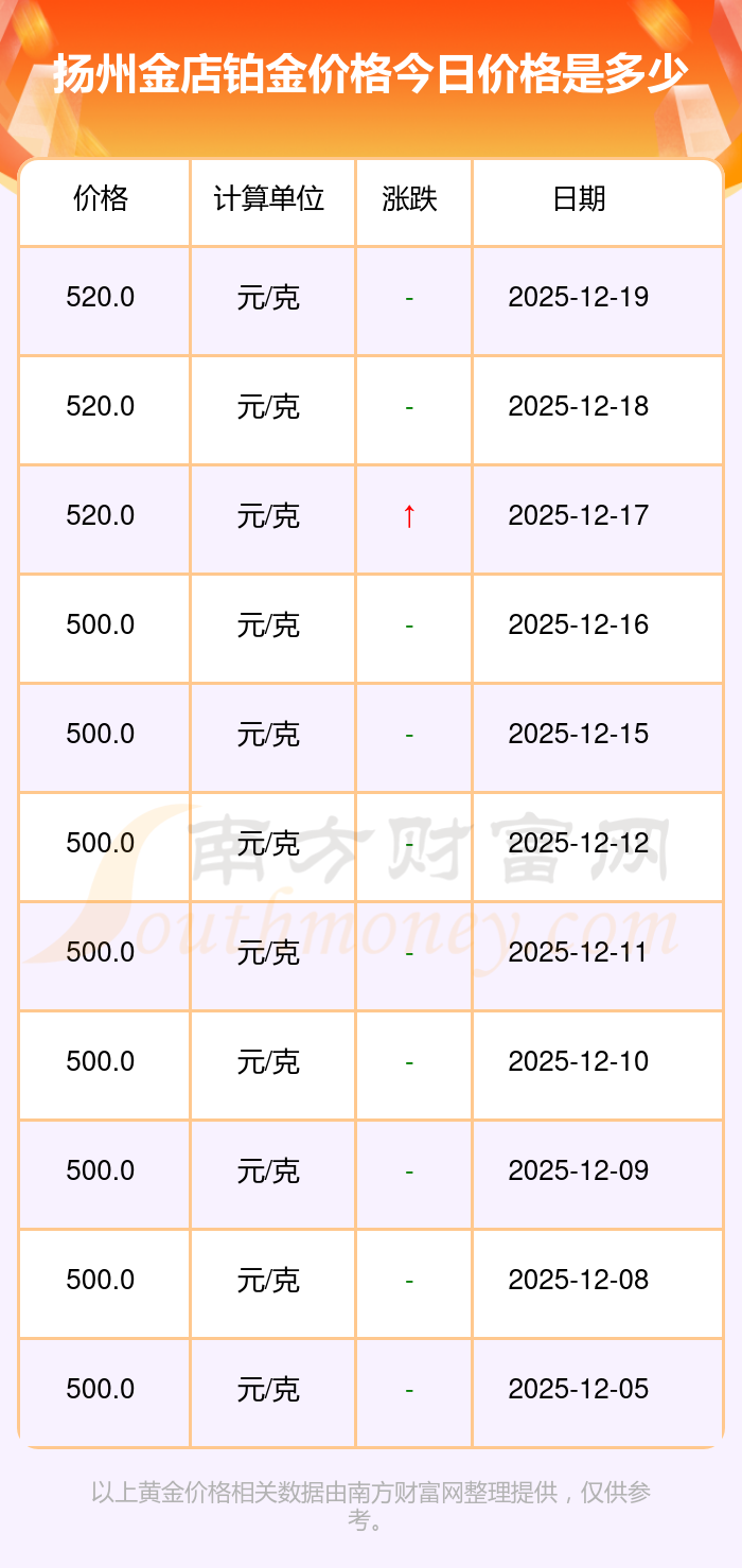 今日(2025年12月21日),揚(yáng)州金店鉑金價(jià)格:520.0元/克。