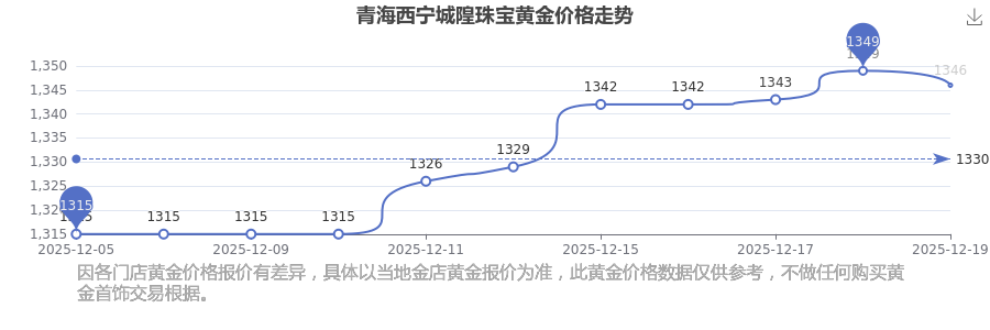 2025年12月21日這一天,青海西寧城隍珠寶的黃金價(jià)格以 1346.0元/克的價(jià)格售賣。
