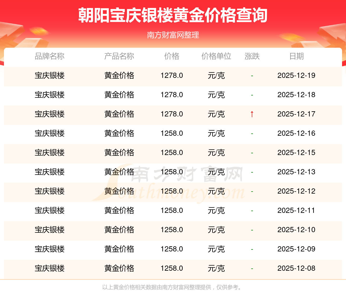 今日朝陽寶慶銀樓黃金價(jià)格最新為:1278.0元/克。