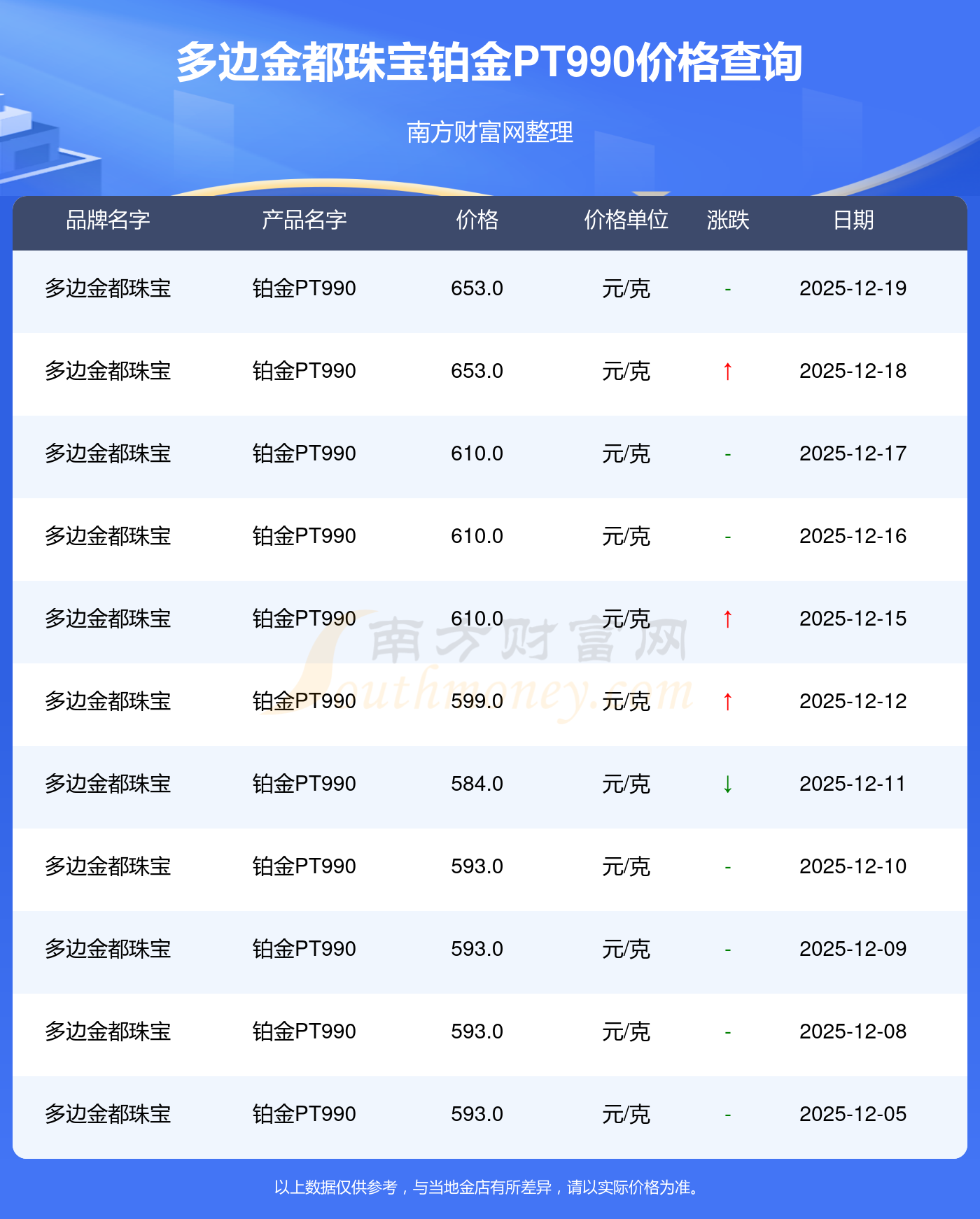 多邊金都珠寶今日 鉑金PT990的最新市場行情價為653.0元/克。