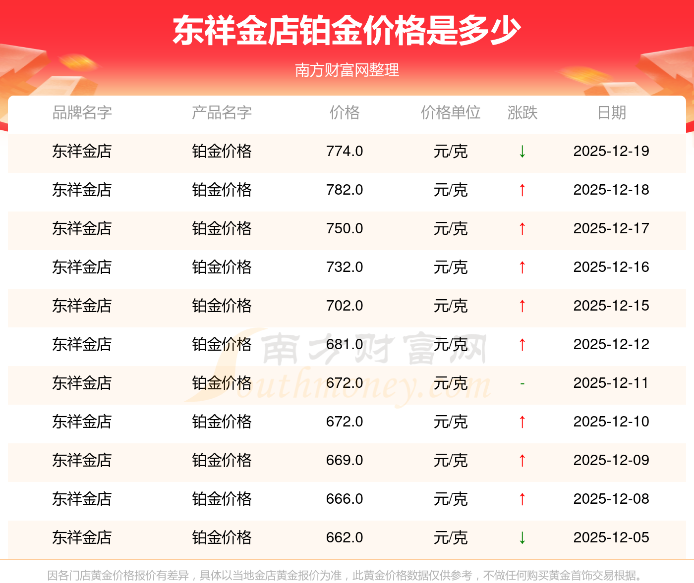 2025年12月21日東祥金店鉑金價(jià)格為774.0元/克。