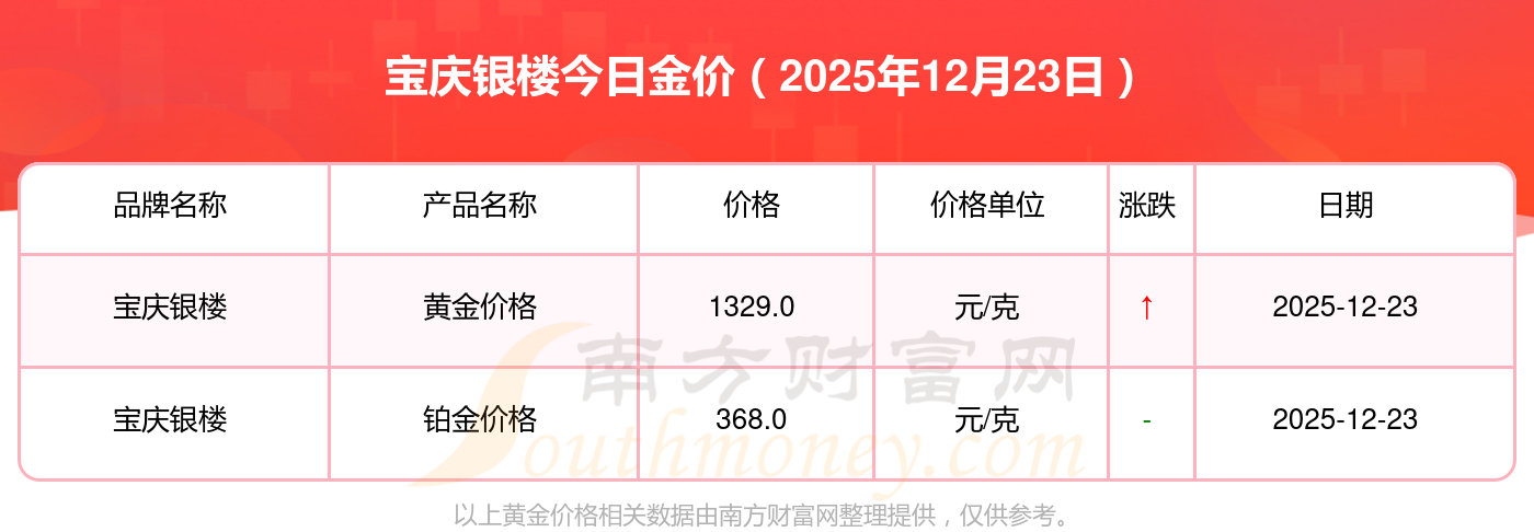 2025年12月23日寶慶銀樓最新價(jià)格:黃金價(jià)格1395.0元/克,鉑金價(jià)格720.0元/克,黃金價(jià)格1403.0元/克,鉑金價(jià)格861.0元/克,黃金價(jià)格1328.0元/克,鉑金價(jià)格364.0元/克,黃金價(jià)格1288.0元/克,金條價(jià)格1152.0元/克,黃金價(jià)格1391.0元/克,黃金價(jià)格1360.0元/克,鉑金價(jià)格720.0元/克。