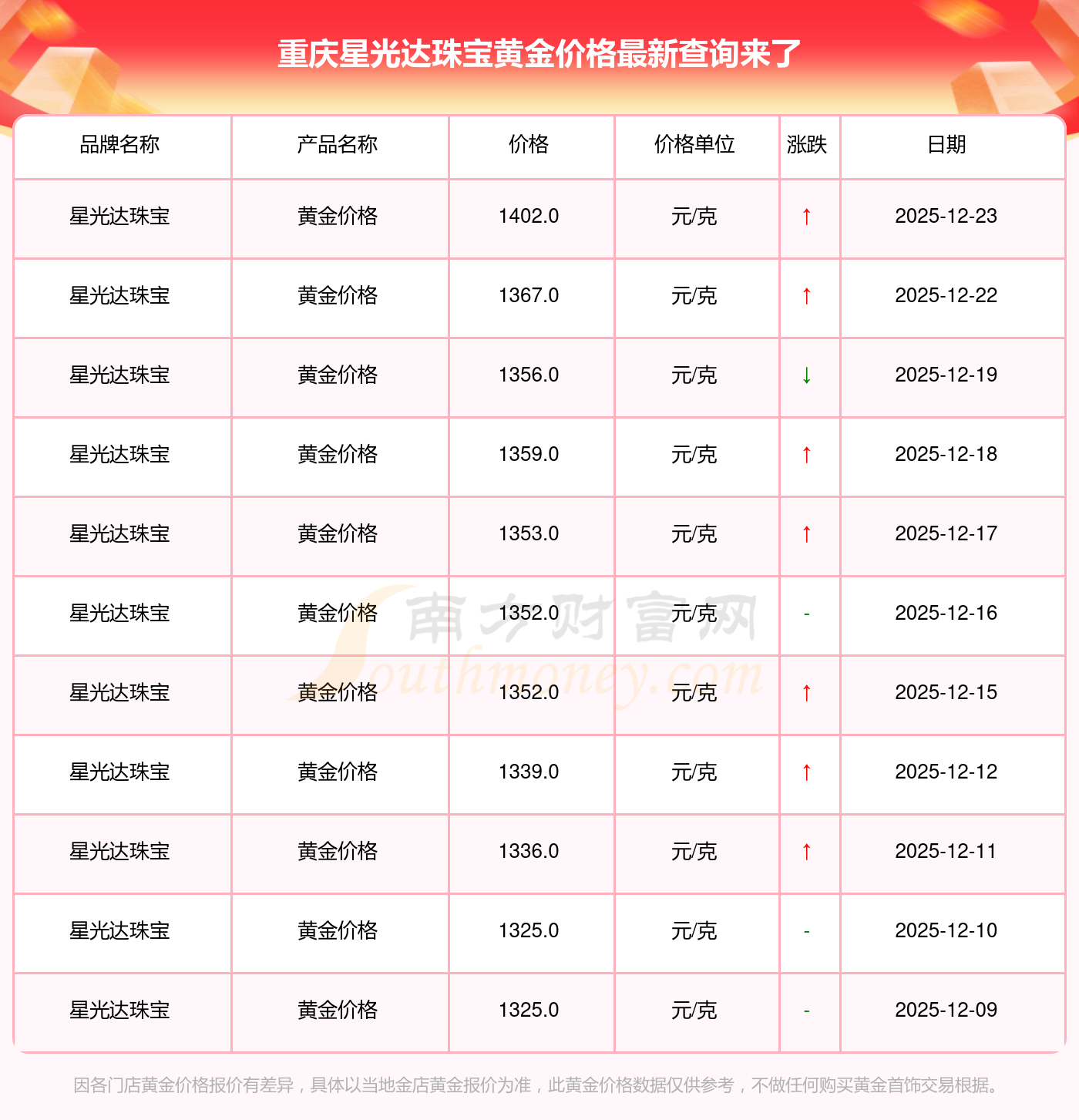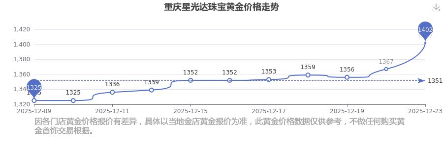 重慶星光達(dá)珠寶的黃金價(jià)格在今日(2025年12月23日),每克售價(jià)為1402.0元/克。