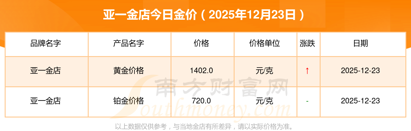 2025年12月23日,金鷺首飾、金鷺首飾、東祥金店、東祥金店、萃華金店、萃華金店、百泰黃金、百泰黃金、金象珠寶、常州金店、常州金店等各大金店品牌黃金價格今日價格如下:金鷺首飾1395.0元/克、金鷺首飾720.0元/克、東祥金店1403.0元/克、東祥金店861.0元/克、萃華金店1328.0元/克、萃華金店364.0元/克、百泰黃金1288.0元/克、百泰黃金1152.0元/克、金象珠寶1391.0元/克、常州金店1360.0元/克、常州金店720.0元/克。
