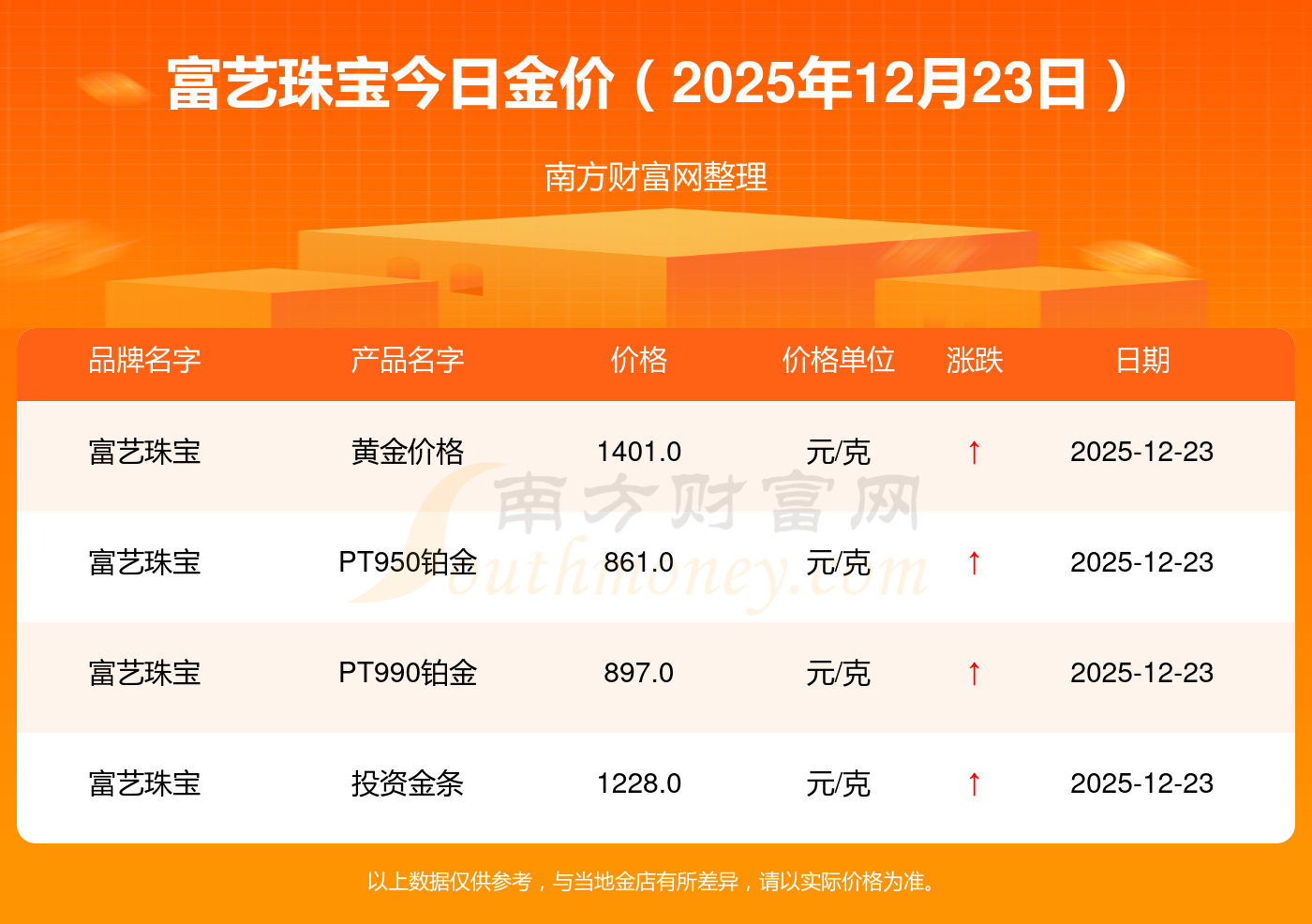 2025年12月23日富藝珠寶金價查詢:黃金價格1395.0元/克,鉑金價格720.0元/克,黃金價格1403.0元/克,鉑金價格861.0元/克,黃金價格1328.0元/克,鉑金價格364.0元/克,黃金價格1288.0元/克,金條價格1152.0元/克,黃金價格1391.0元/克,黃金價格1360.0元/克,鉑金價格720.0元/克。