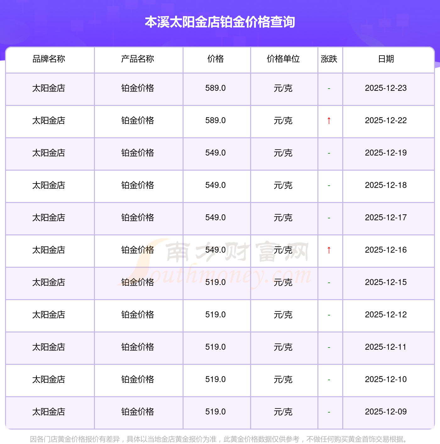今日(2025年12月23日)本溪太陽金店鉑金價(jià)格最新價(jià)格為589.0元/克。