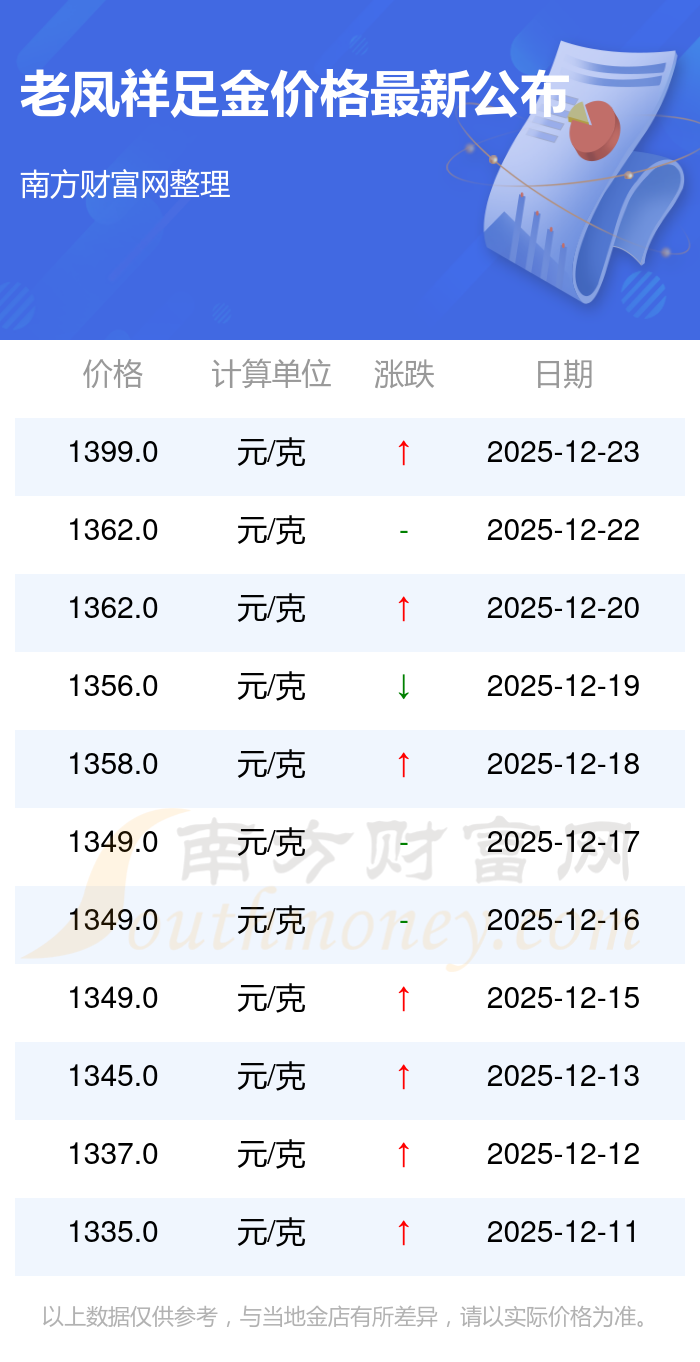 老鳳祥今日足金價格的最新標(biāo)價為1399.0元/克。