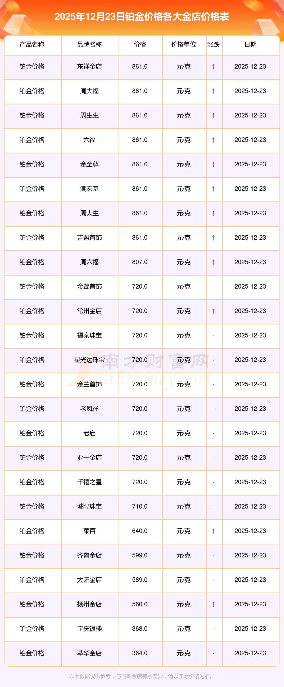 2025年12月23日金鷺首飾、金鷺首飾、東祥金店、東祥金店、萃華金店、萃華金店、百泰黃金、百泰黃金、金象珠寶、常州金店、常州金店等各大金店品牌鉑金價(jià)格最新價(jià)格如下:金鷺首飾黃金價(jià)格1395.0元/克,金鷺首飾鉑金價(jià)格720.0元/克,東祥金店黃金價(jià)格1403.0元/克,東祥金店鉑金價(jià)格861.0元/克,萃華金店黃金價(jià)格1328.0元/克,萃華金店鉑金價(jià)格364.0元/克,百泰黃金黃金價(jià)格1288.0元/克,百泰黃金金條價(jià)格1152.0元/克,金象珠寶黃金價(jià)格1391.0元/克,常州金店黃金價(jià)格1360.0元/克,常州金店鉑金價(jià)格720.0元/克。