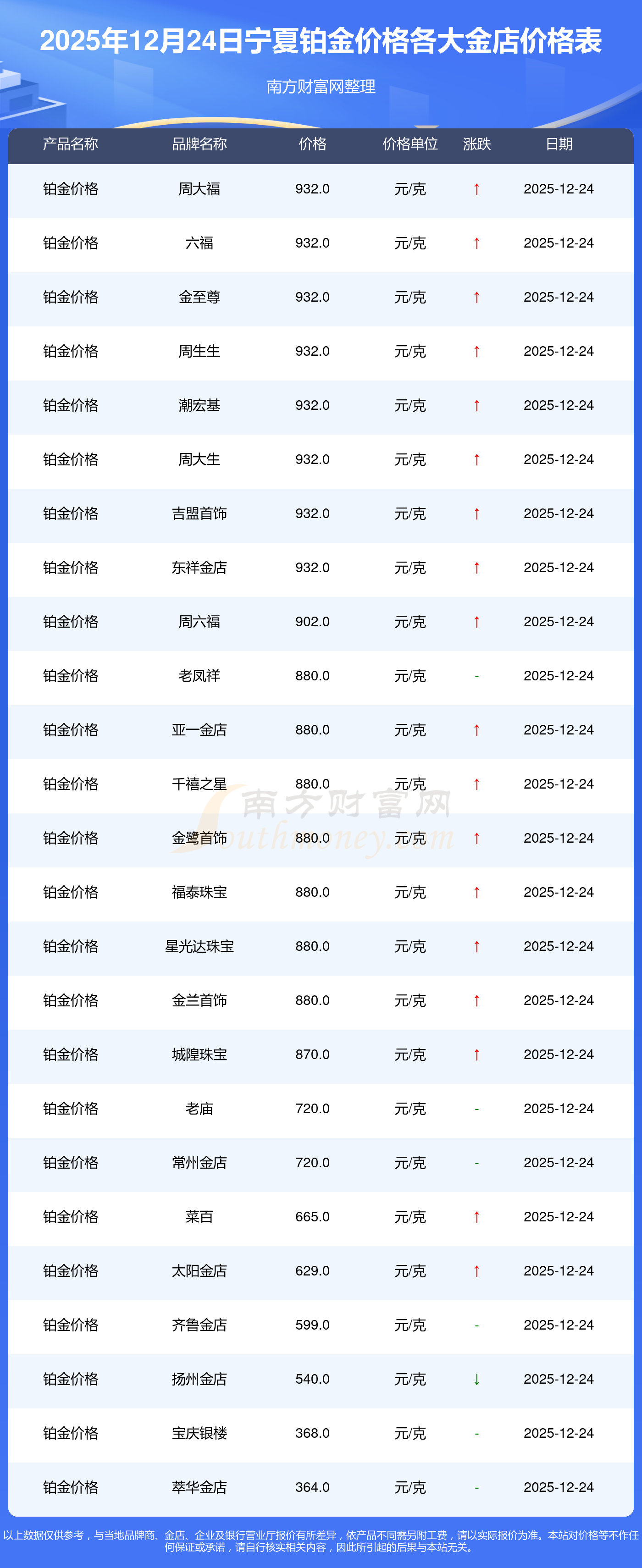 今天是2025年12月24日,寧夏周大福、周大福、老鳳祥、老鳳祥、六福、六福、六福、老廟、老廟、金至尊、金至尊等各大金店品牌鉑金價格最新價格如下:周大福1410.0元/克、周大福932.0元/克、老鳳祥1406.0元/克、老鳳祥880.0元/克、六福1408.0元/克、六福932.0元/克、六福27300.0、老廟1413.0元/克、老廟720.0元/克、金至尊1408.0元/克、金至尊932.0元/克。