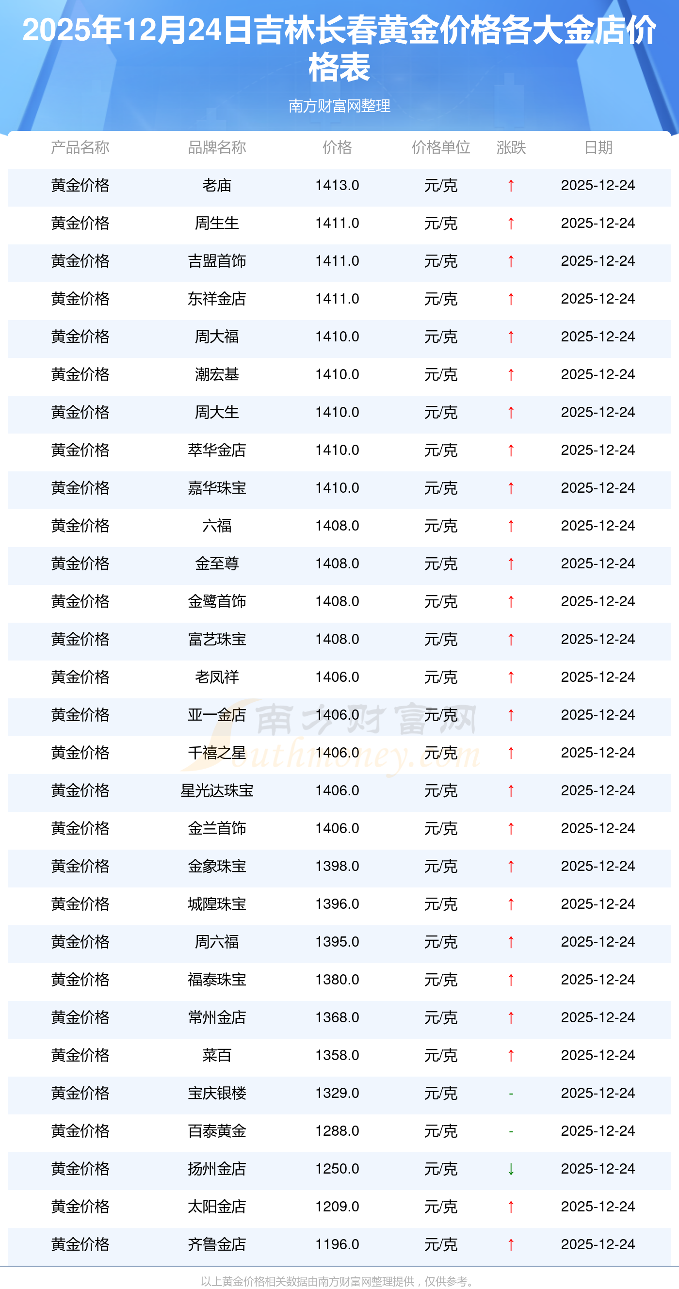 2025年12月24日吉林長(zhǎng)春周大福、周大福、老鳳祥、老鳳祥、六福、六福、六福、老廟、老廟、金至尊、金至尊等各大金店品牌黃金價(jià)格最新價(jià)格行情來了,如下:周大福黃金價(jià)格1410.0元/克,周大福鉑金價(jià)格932.0元/克,老鳳祥黃金價(jià)格1406.0元/克,老鳳祥鉑金價(jià)格880.0元/克,六福黃金價(jià)格1408.0元/克,六福鉑金價(jià)格932.0元/克,六福鉑金價(jià)格(香港)27300.0,老廟黃金價(jià)格1413.0元/克,老廟鉑金價(jià)格720.0元/克,金至尊黃金價(jià)格1408.0元/克,金至尊鉑金價(jià)格932.0元/克。