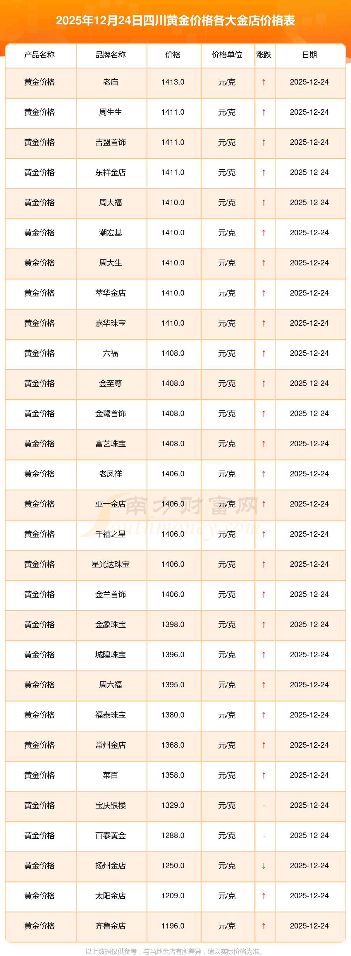 2025年12月24日四川各大金店黃金價(jià)格最新價(jià)格查詢來了:周大福1410.0元/克,周大福932.0元/克,老鳳祥1406.0元/克,老鳳祥880.0元/克,六福1408.0元/克,六福932.0元/克,六福27300.0,老廟1413.0元/克,老廟720.0元/克,金至尊1408.0元/克,金至尊932.0元/克。