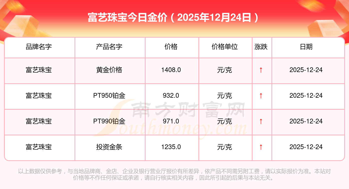 2025年12月24日富藝珠寶今日價格:黃金價格1410.0元/克,鉑金價格932.0元/克,黃金價格1406.0元/克,鉑金價格880.0元/克,黃金價格1408.0元/克,鉑金價格932.0元/克,鉑金價格(香港)27300.0,黃金價格1413.0元/克,鉑金價格720.0元/克,黃金價格1408.0元/克,鉑金價格932.0元/克。