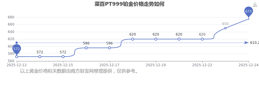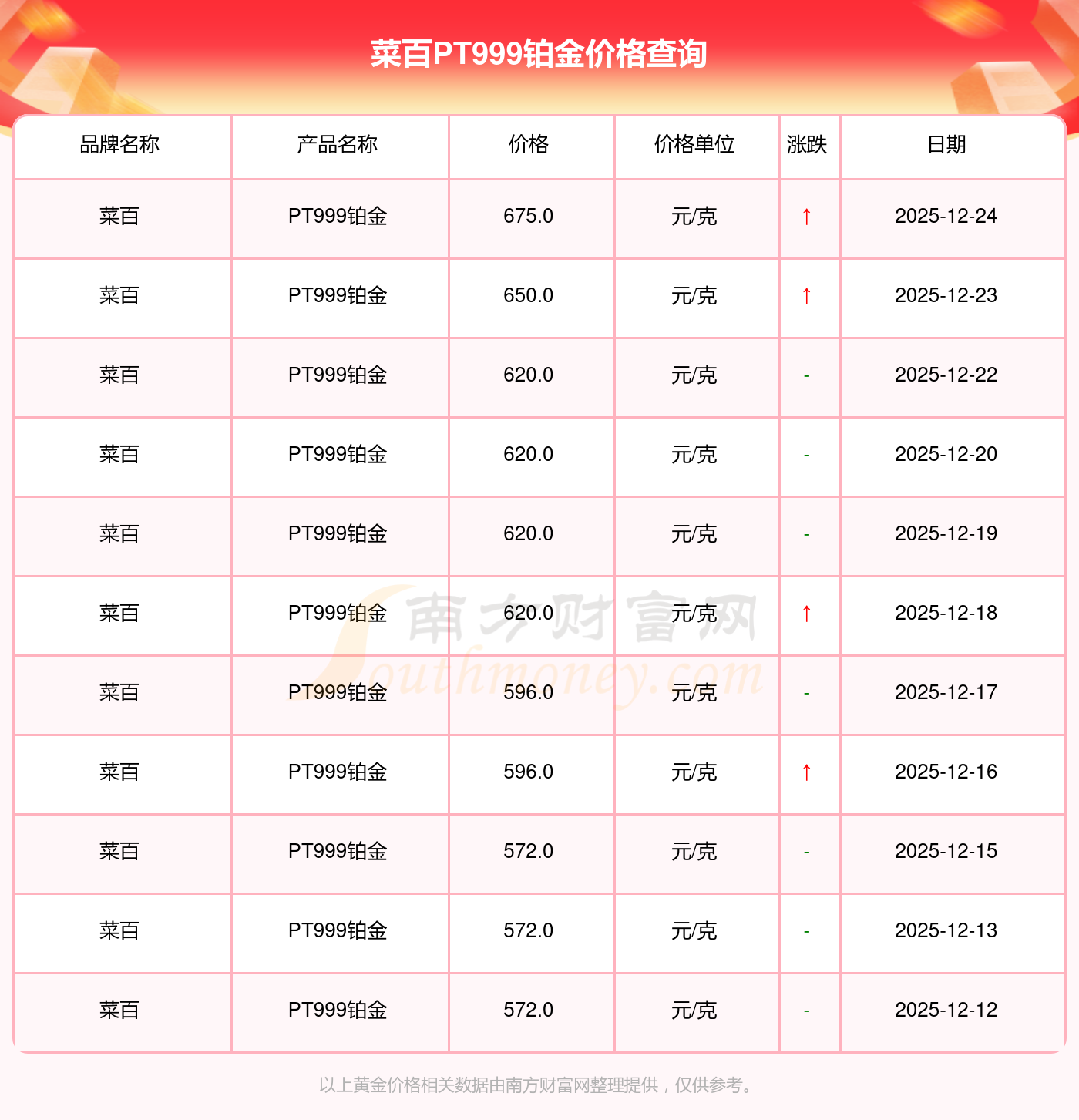 據(jù)了解,今日菜百 PT999鉑金的最新價格為675.0元/克。