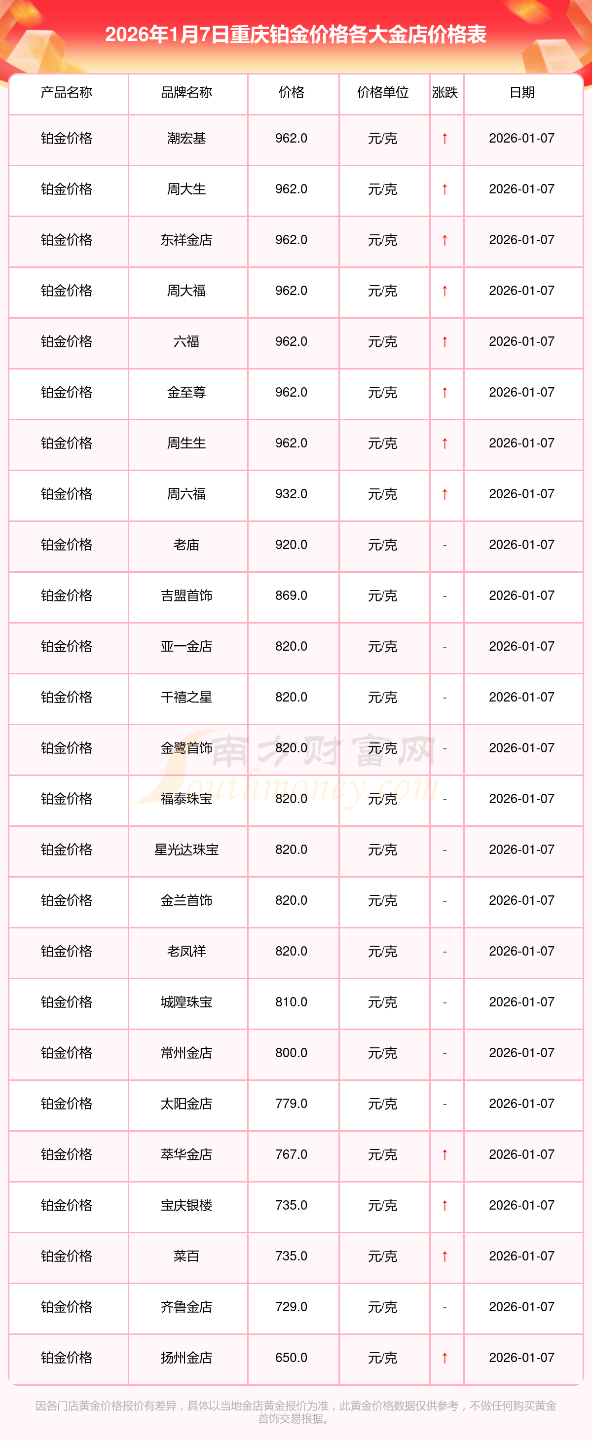 2026年1月7日,重慶周生生、潮宏基、潮宏基、周大生、周大生、亞一金店、亞一金店、寶慶銀樓、寶慶銀樓、太陽金店、太陽金店等各大金店品牌鉑金價格今日價格行情最新來了:周生生1226.0元/克、潮宏基1398.0元/克、潮宏基962.0元/克、周大生1398.0元/克、周大生962.0元/克、亞一金店1402.0元/克、亞一金店820.0元/克、寶慶銀樓1316.0元/克、寶慶銀樓735.0元/克、太陽金店1209.0元/克、太陽金店779.0元/克。