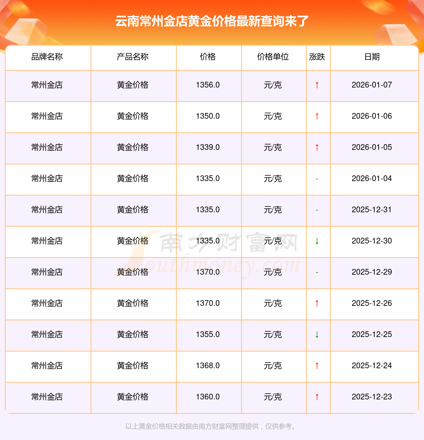 今日2026年1月7日,云南常州金店黃金價格為1356.0元/克。