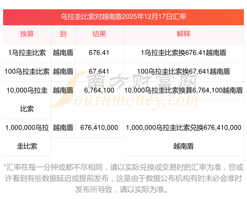 南方財(cái)富網(wǎng)為您提供烏拉圭比索對越南盾匯率最新價(jià)格詳情。