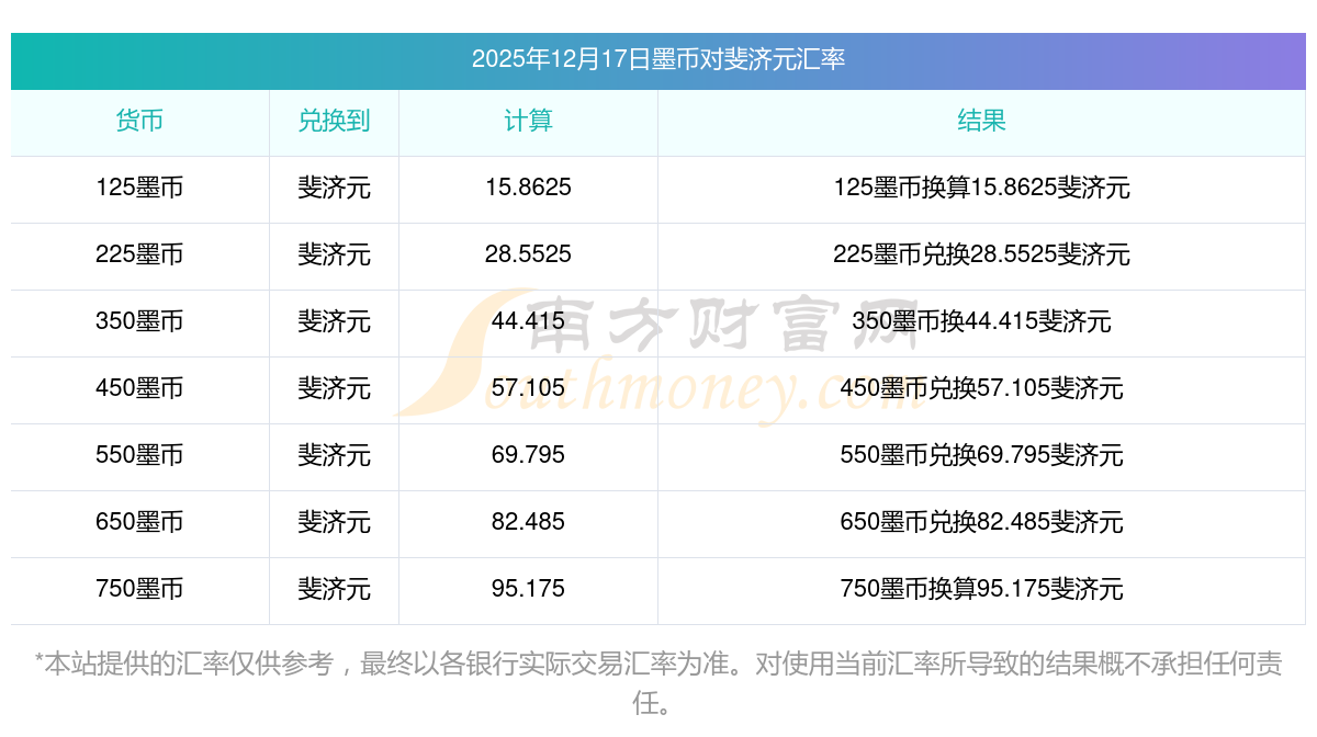匯率三十八墨幣等于多少斐濟(jì)元2025年12月17日