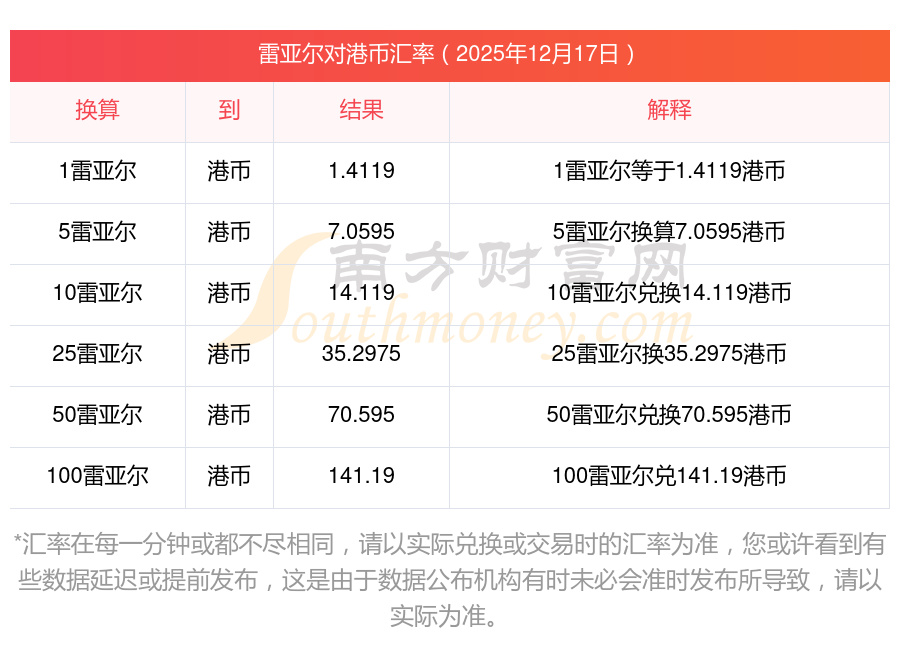 南方財富網(wǎng)為您提供雷亞爾對港幣匯率最新價格詳情。