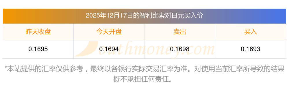 2025年12月17日智利比索對(duì)日元的匯率為:0.1696