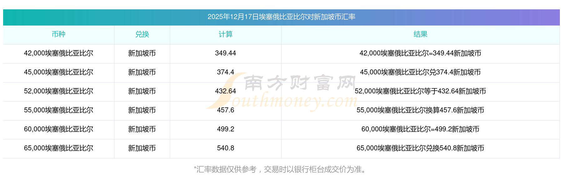 南方財(cái)富網(wǎng)為您提供埃塞俄比亞比爾對(duì)新加坡幣匯率最新價(jià)格詳情。