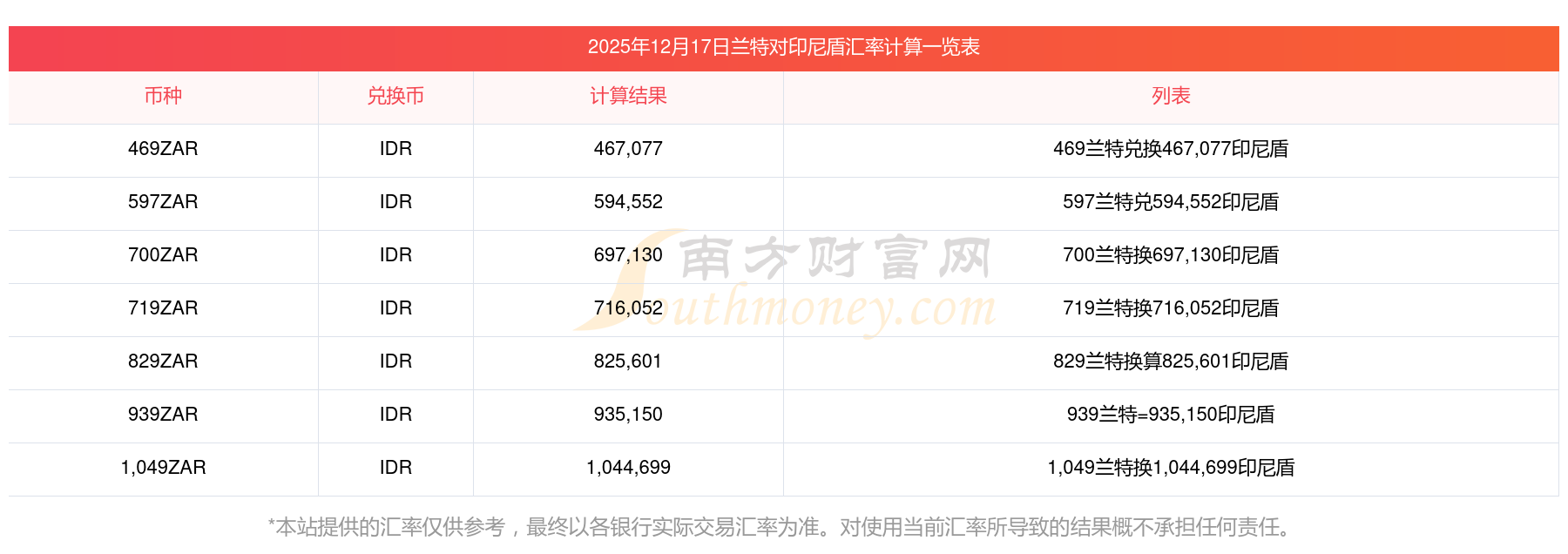 今天匯率更新!2025年12月17日4蘭特兌換印尼盾是多少?