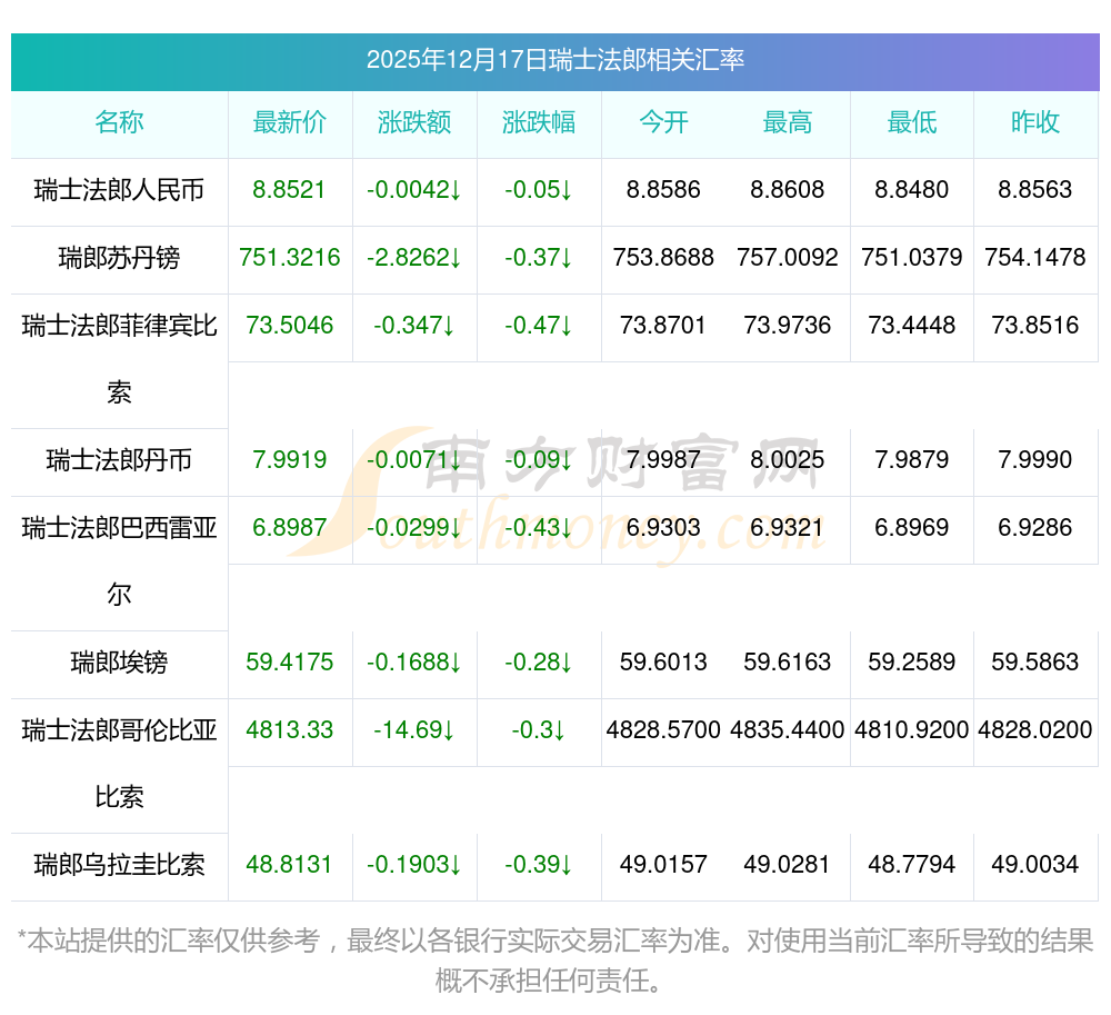 2025年12月17日瑞士法郎相關(guān)匯率查詢