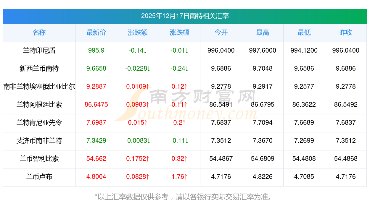 根據(jù)2025年12月17日匯率計(jì)算,ZAR兌換BRL匯率最新價(jià)0.329100,今開價(jià)0.3288,昨收價(jià)0.3288,最高價(jià)0.3294,最低價(jià)0.3281。