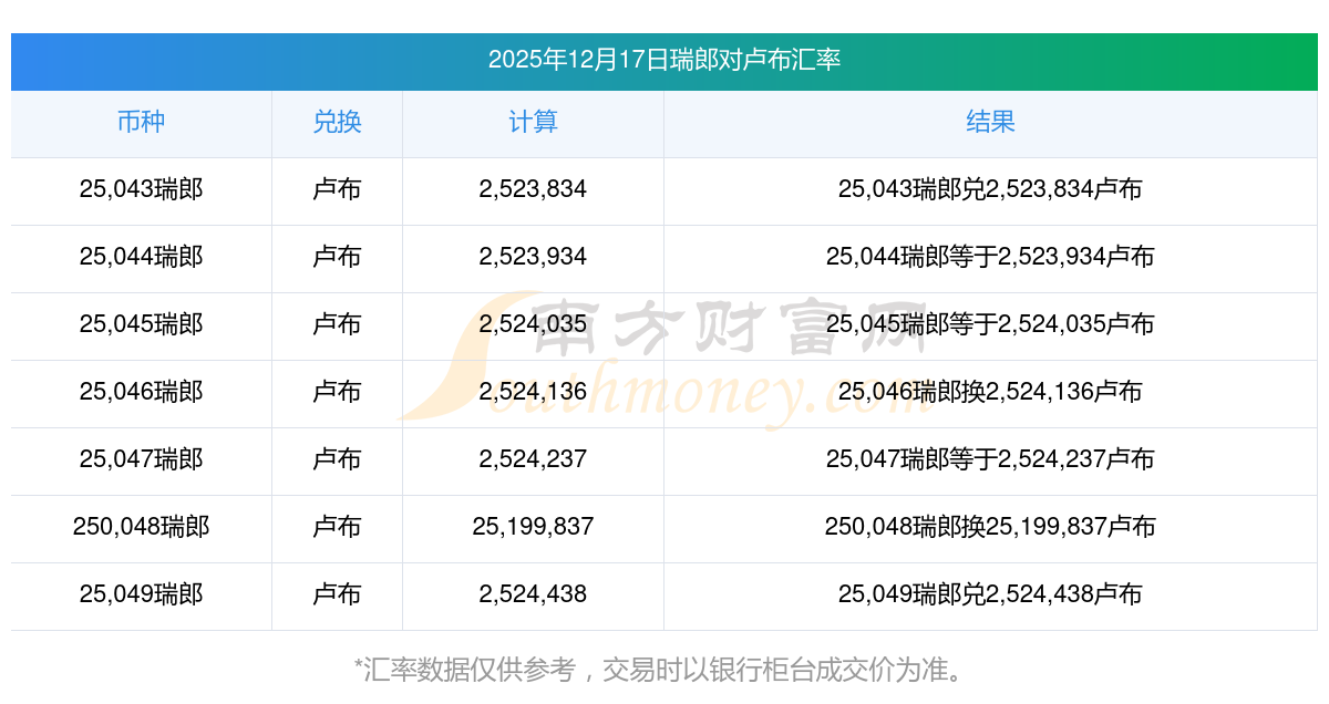 南方財(cái)富網(wǎng)為您提供瑞郎對盧布匯率最新價(jià)格詳情。