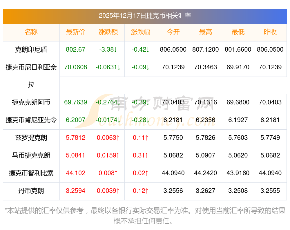 2025年12月17日捷克幣相關(guān)匯率查詢