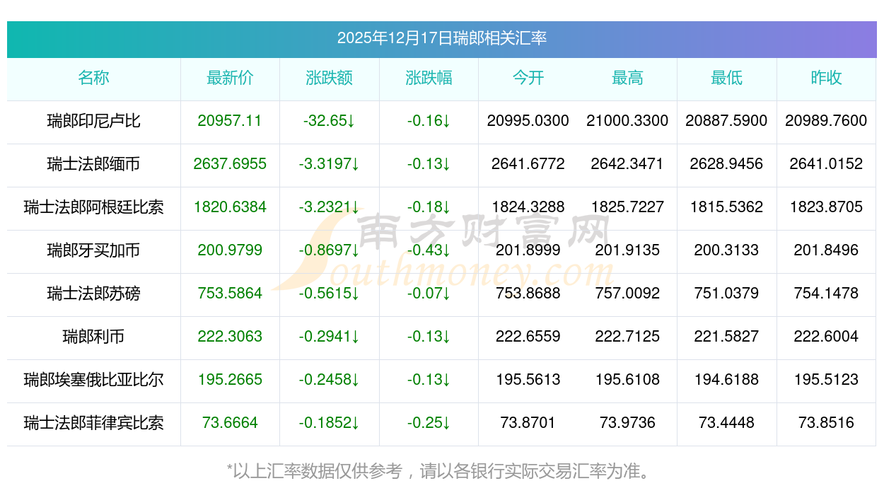 2025年12月17日瑞郎相關(guān)匯率查詢