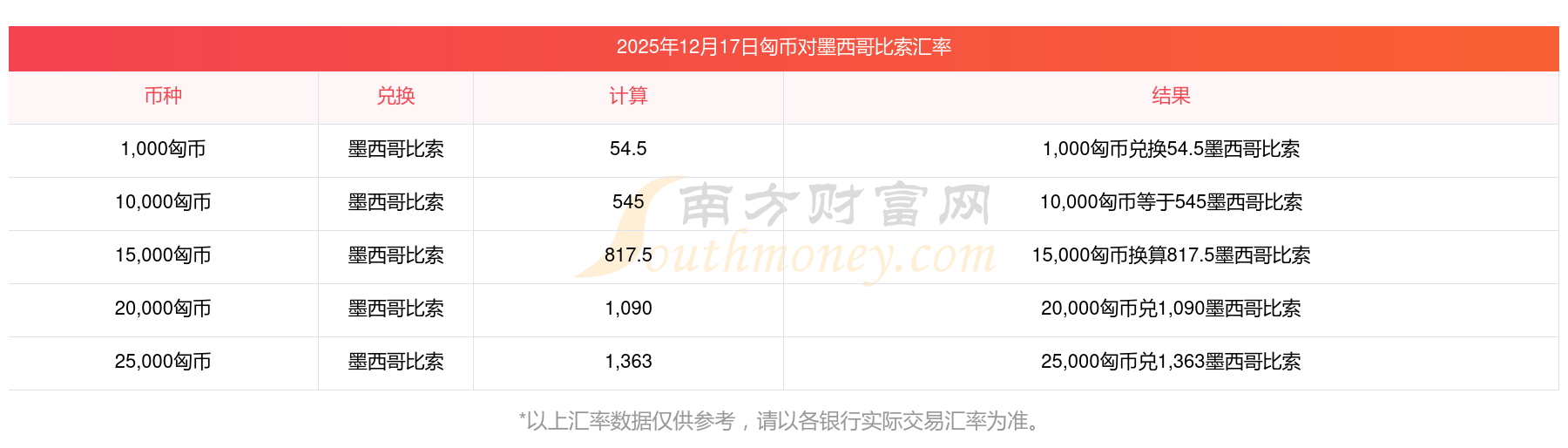 今天匯率更新!2025年12月17日62匈幣兌換墨西哥比索是多少?