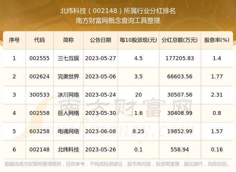 按照南方財富網(wǎng)趨勢選股系統(tǒng)統(tǒng)計,北緯科技所屬行業(yè)為通信服務行業(yè),通信服務行業(yè)分紅排名情況如下表: