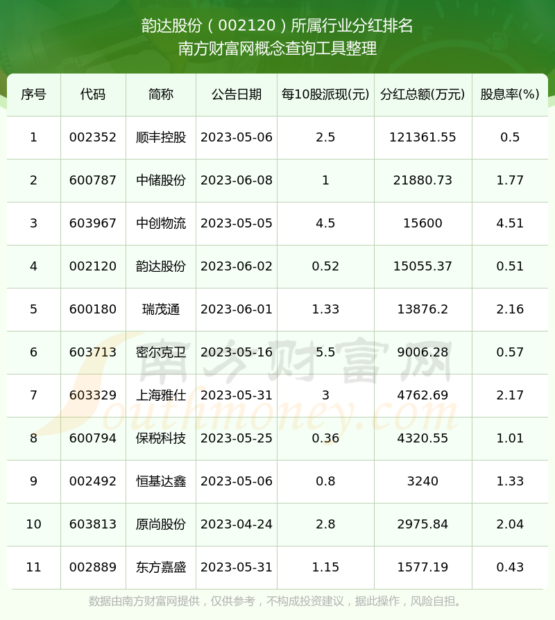 按照南方財富網(wǎng)趨勢選股系統(tǒng)統(tǒng)計,韻達股份所屬行業(yè)為物流行業(yè)行業(yè),物流行業(yè)行業(yè)分紅排名情況如下表: