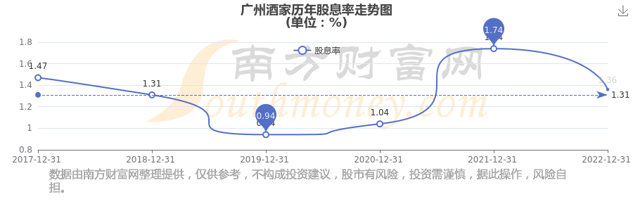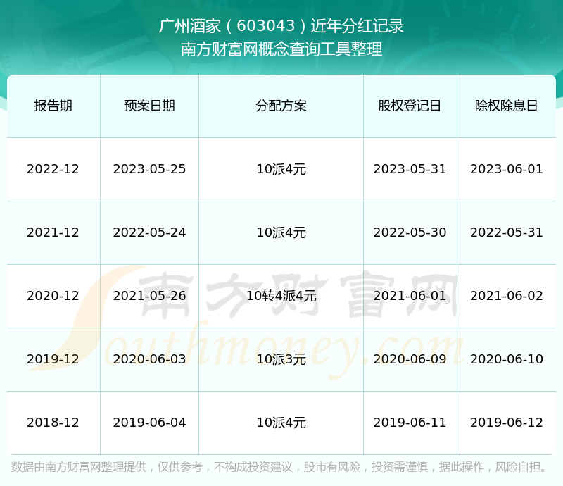 廣州酒家最新一次公布的分紅方案為10派4元。本次權(quán)益分派股權(quán)登記日為2023年5月31日,除權(quán)除息日為2023年6月1日,派息日為2023年6月1日。